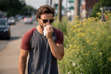 man passing by blooming flowers wiping his nose with a tissue. seasonal allergies, pollinosis concept.