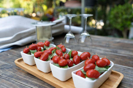 Canapes on toothpicks, appetizer, pinchos, spanish food. Quail eggs and cherry tomatoes.