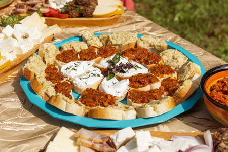 Plates with snacks on servered buffet table at wedding reception outdoors, copy space. Grilled mushrooms with cheese. Sandwiches, appetizer bruschetta, antipast, crostini, tapas. top view, flat lay