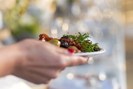 Waitress in holding a plate with canapes. catering service. wedding welcome food. Сanapes (shrimp, mozzarella, sun-dried tomatoes). Welcome buffet at the event.