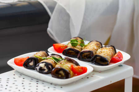 Eggplant rolls with nuts. Caucasian cuisine. Vegetarian food.