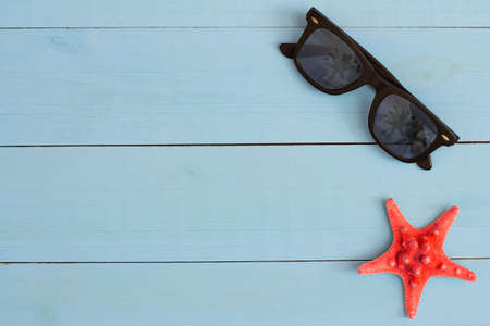 Summer time on a cool view on painted light blue wood table with sunglasses and starfish