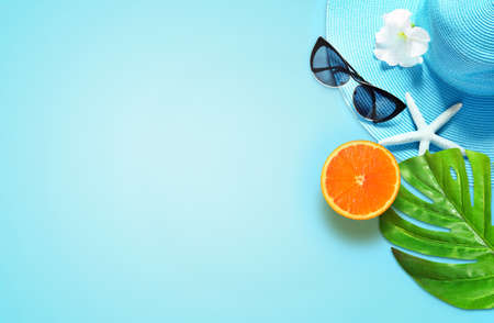 Hat, sunglasses, sunscreen, beach slippers and starfish with palm leaf on a blue wooden background with copy space, summer background.