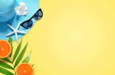 Summer holiday vacation beach accessories flat lay top view with copy space