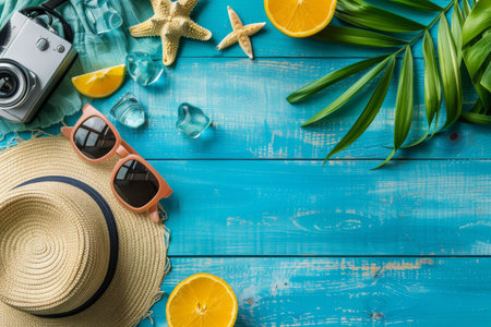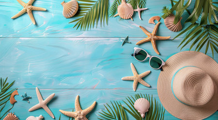 A flat lay showcasing various summer beach vacation essentials. Items include sunglasses, a straw hat, seashells, starfish, and palm leaves on a blue wooden background.