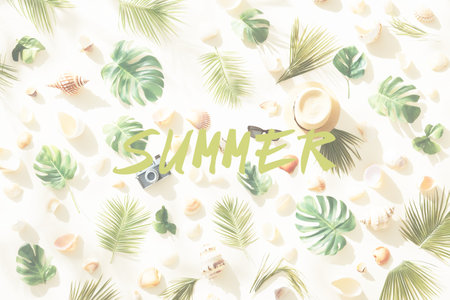 Flat lay summer composition with seashells, tropical palm leaves, a straw hat, and stylish sunglasses on a sand. Banner with the inscription Summer. Concept of vacation, beach, and travel themes