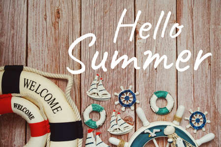 Hello Summer typography text with summer decoration on wooden background
