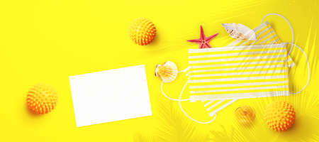 Summer travel flat lay background. Old film camera, hat, sunglasses, shell and palm leaves on yellow background. Long banner format.