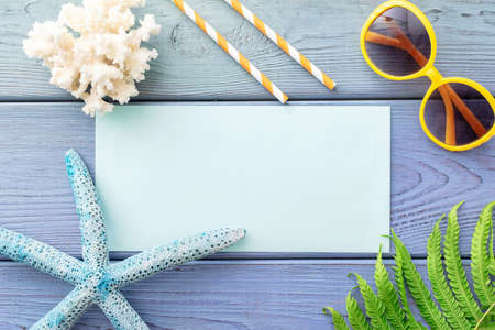 Word summer and paper with copy space on blue wooden background. top view