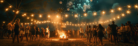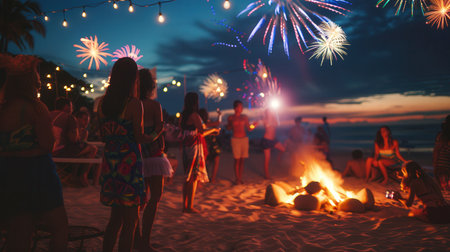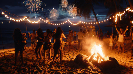 People gather on the beach, dancing around a bonfire while fireworks light up the night sky and colorful lights create a festive atmosphere.