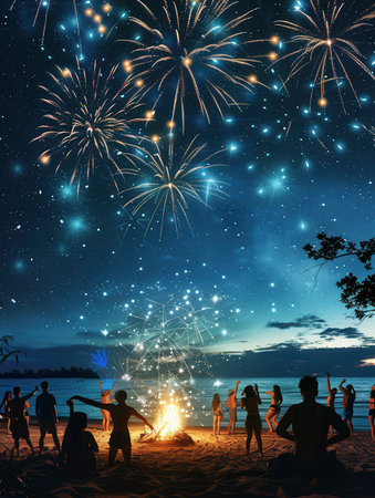 Friends gather around a bonfire on the beach, enjoying music, dancing, and fireworks illuminating the night sky.