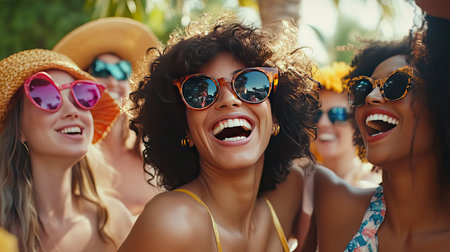 A lively group of joyful women enjoying a summer party outdoors, wearing colorful sunglasses and bright swimwear, radiating happiness and togetherness.