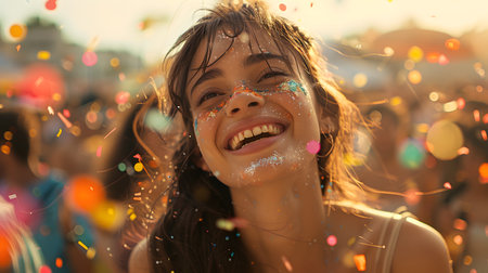 Happy young woman with confetti on her face having fun at a music festival