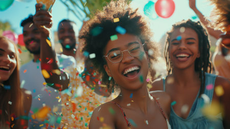 A diverse group of people are seen outdoors, joyfully celebrating a festive occasion. The image features a bright, natural setting with warm lighting. Confetti fills the air, adding to the celebratory atmosphere. This image is suitable for a variety of uses, including editorial and commercial projects.