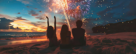 A vibrant beach scene with friends enjoying a firework display at sunset, capturing joy and celebration in a stunning landscape.