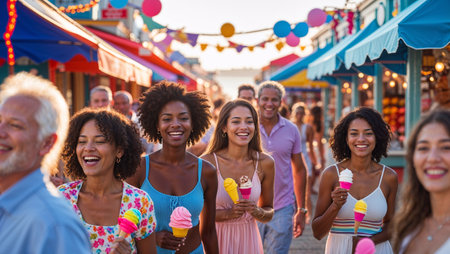 Summer festival with friends enjoying ice cream in a vibrant market atmosphere