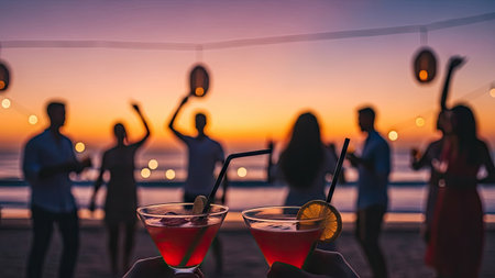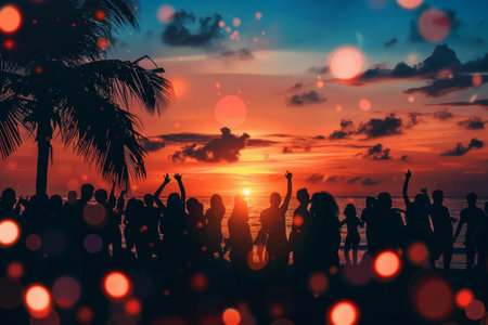 Silhouettes sway in a vibrant sunset at a tropical beach dance party, epitomizing summer joy