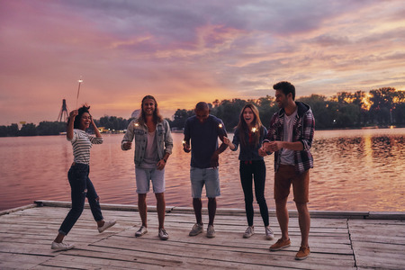 Pure happiness. Full length of young people in casual wear smiling and holding sparkers while standing on the pier