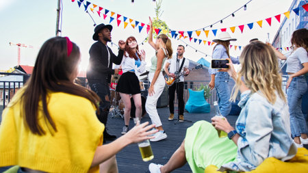 Sunset Celebration with Friends on Rooftop. Generative ai. High quality illustration