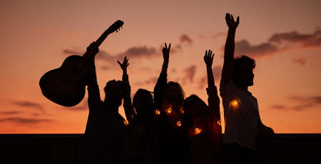 In this photo, a group of young adults laugh in celebration at sunset, enjoying a concert at an unforgettable music event during summer.