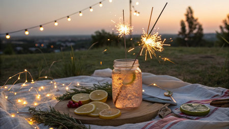 Lemonade in a glass jar with sparklers and lemon slices.