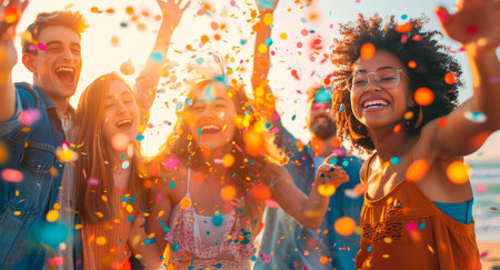 A diverse group of people are seen celebrating with raised arms and joyful expressions at an outdoor festival. Confetti fills the air, illuminated by warm sunlight. The scene suggests a lively atmosphere with hints of a stage and music. Suitable for illustrating events, entertainment or promoting concepts of celebration.
