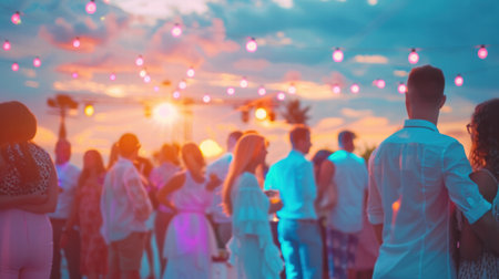Blurred abstract summer sunset party scene with pink and blue pastel hues