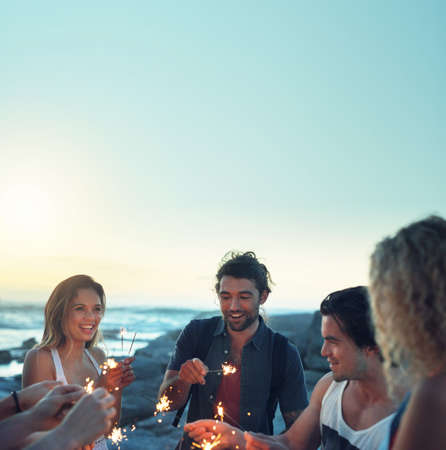A group of happy friends holding lit sparklers on a beach at twilight with a bonfire in the background. They are smiling and celebrating, enjoying a summer evening party by the ocean.