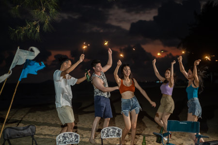Asian group of friends having outdoor garden barbecue laughing with alcoholic beer drinks and showing group of friends having fun with sparklers on night ,soft focus