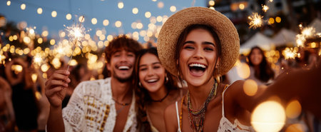 A joyful group of friends celebrating with sparklers at a lively outdoor party setting