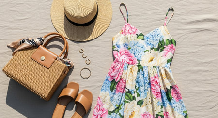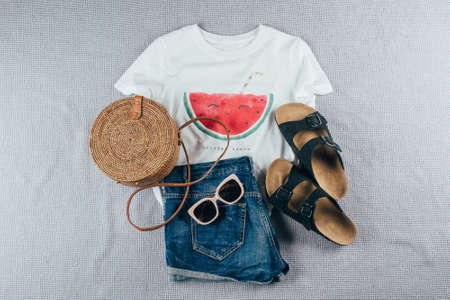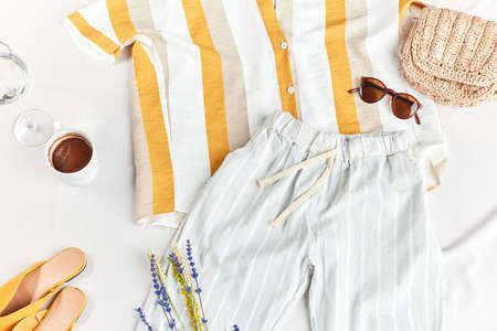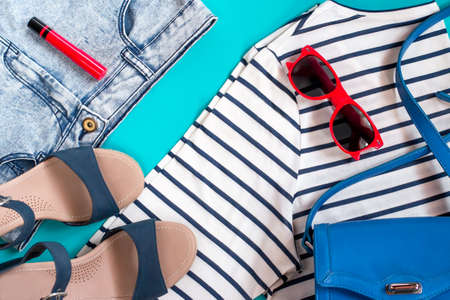 Casual spring/summer female clothing set. Vacation clothes and accessories concept.