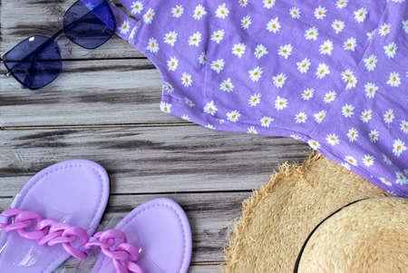 Flat shot of womens summer purple clothes on a wooden background: hat, dress, glasses, trendy slippers.
