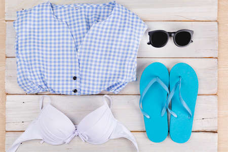 Feminine summer background. Striped slippers and shirt, sunglasses, blue wooden background.