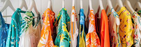 Assortment of vibrant scarves hanging neatly on a rack. Bright and eye-catching display of scarves in a clothing showroom.