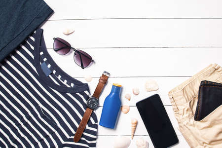Top view. accessories clothes travel summer concept ,the beach with white black shirt sunglasses lotion cream vintage watch,hat, jeans of bag and seashell. as mock-up blank space phone
