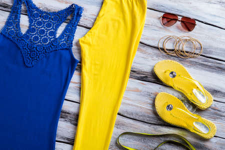 Blue tank top and sunglasses. Casual pants with flip flops. Brand new apparel on display. Quality goods in clothing store.