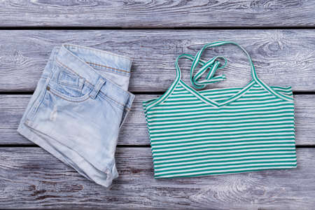 Woman's tank top and shorts. Female wardrobe on wooden background. Light female summer outfit. Nice summer outfit with accessories.