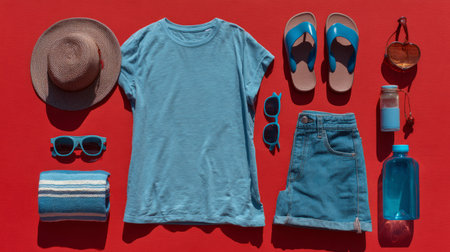 Summer fashion flat lay, blue tee, shorts, hat, sunglasses, flip-flops, and bottle, organized neatly on red background, modern tone
