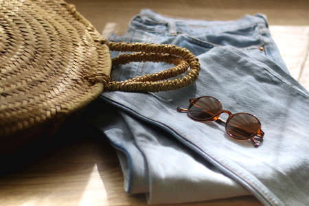 Vintage mom jeans, round straw bag and sunglasses on wooden background. Selective focus.