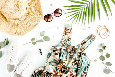 Female, summer street style. Sundress-dress, straw hat, sneakers, sunglasses and tropical leaf. Top view, flat lay.