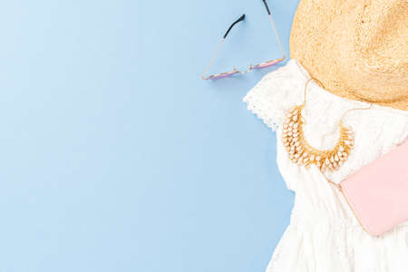 Flat lay fashion women summer beachwear accessories: sunglasses, shirt, hat, belt. Travel vacation background. Top view