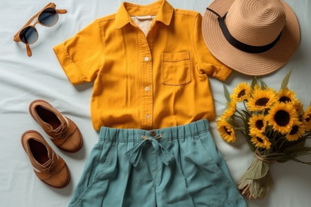 Flat lay of yellow shirt, blue skirt, brown shoes and sunflowers on white bed