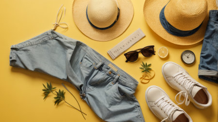 modern pastel fashion flat lay, gray t-shirt, yellow shorts, and hat, cozy light tones, clean minimalist arrangement, balanced composition