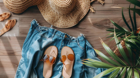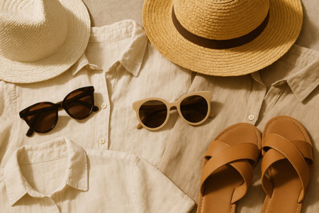 Flat lay of summer fashion essentials, including straw hats, chic sunglasses, and casual leather sandals. neatly arranged linen shirts complement the accessories, creating a relaxed and sophisticated warm-weather look perfect for a stylish getaway.