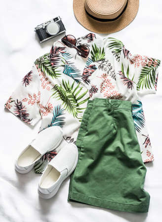 Summer vacation walking women's clothing - shirt plant print short sleeve, bermuda shorts, sneakers shoes, bag and hat on a light background, top view