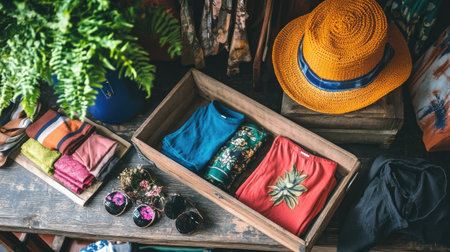 A charming summer fashion display featuring colorful clothing, a stylish hat, and sunglasses, arranged in a rustic wooden tray with a touch of greenery.