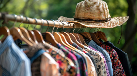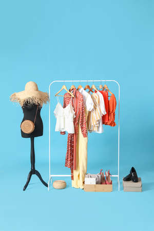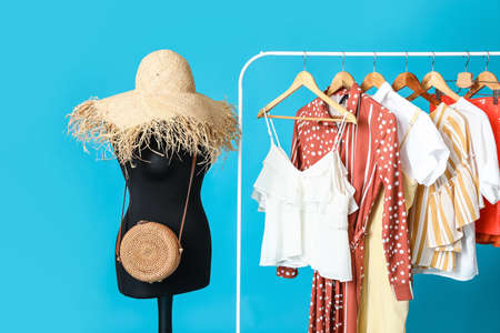 Aesthetic minimalist fashion influencer blog composition. Stylish pastel summer female clothes, dress, tops, t-shirts, straw hat on clothing rack against white wall. Fashion women wear