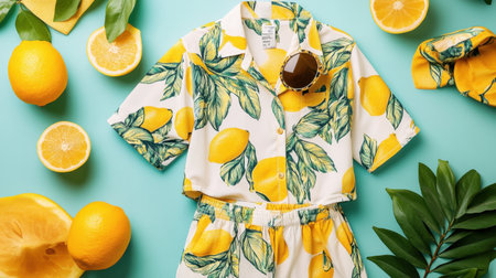 A vibrant summer outfit featuring a lemon print shirt and shorts, styled with sunglasses on a bright aquamarine background, perfect for seasonal fashion statements.