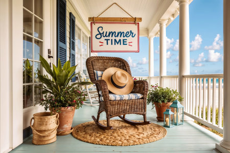 Wicker rocking chair with straw hat sitting on porch of beach house decorated for summertime.