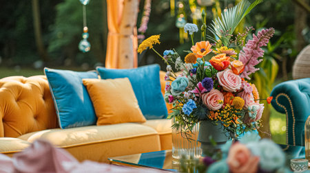 A beautifully curated outdoor lounge area featuring a comfortable sofa adorned with plush cushions, surrounded by a vibrant display of flowers and greenery, perfect for relaxation and enjoyment in a sunlit environment.